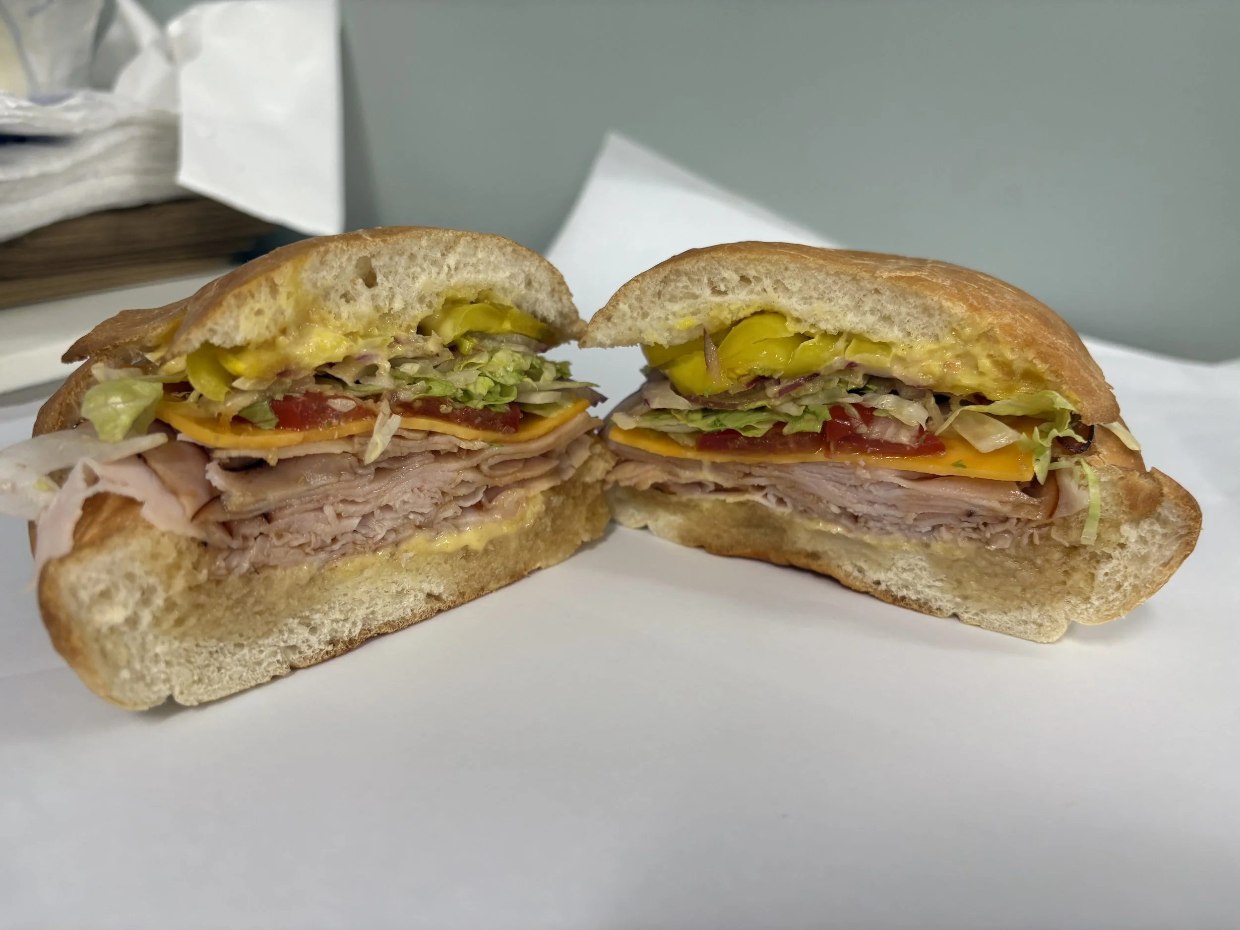 Honey turkey, cheddar cheese, lettuce, tomato, onion, banana peppers, Honey mustard, Mike’s Hot Honey
